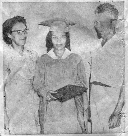 The first graduates from this Indian high school were Rosalie Sanders, George Billiot, Mildred Solet, Willis "Bill" Billiot, and Roy Adam Parfait, a total of five students. The Houma Courier newspaper of Friday, June 1, 1962, carried an account of the event in section 4, page 10, entitled "First Inhabitants of Dulac Graduated from High School." The sub-title declared Greenburg Says Excuse of Ages Lost Through Modern Education. " 'Je ne suis pas instruit' - his excuses for lack of knowledge has been lost by people of the Dulac community en (sic: in) the persons of the five smiling sons and daughters who were graduated in ceremonies from Daigleville Indian High School Monday night in the Dulac Community Center. So affirmed - partly in French, partly in English - guest speaker former District Attorney Leonard Greenburg who predicted that some day the center would be half filled with high school graduates from Dulac.